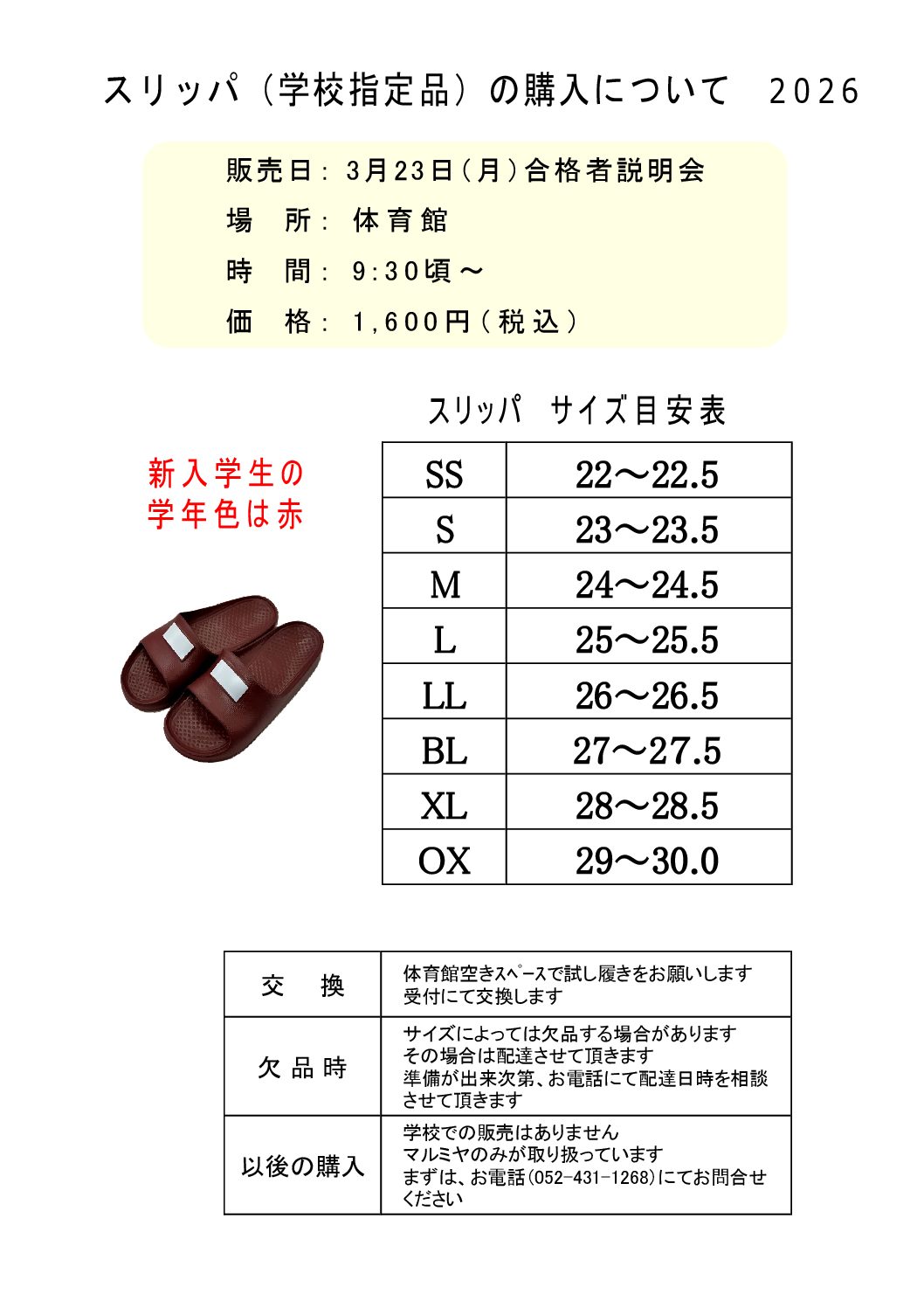 また、学校指定品の「スリッパ(上履き)」も取り扱っています